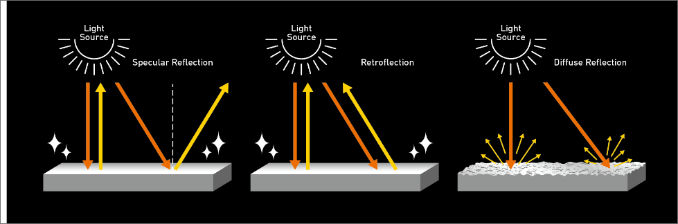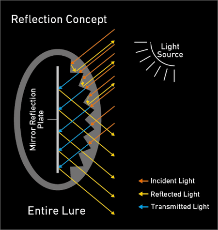 Like a real baitfish, it uses mirror-style (spectacular) reflection to return light strongly in a single direction with minimal loss of brightness. It also incorporates retroflection, which sends light back toward its source for added visibility. Traditional hologram finishes and many conventional lures rely on diffuse reflection, which scatters light in multiple directions. While this creates a wide flash, the brightness is lower and does not travel as far.